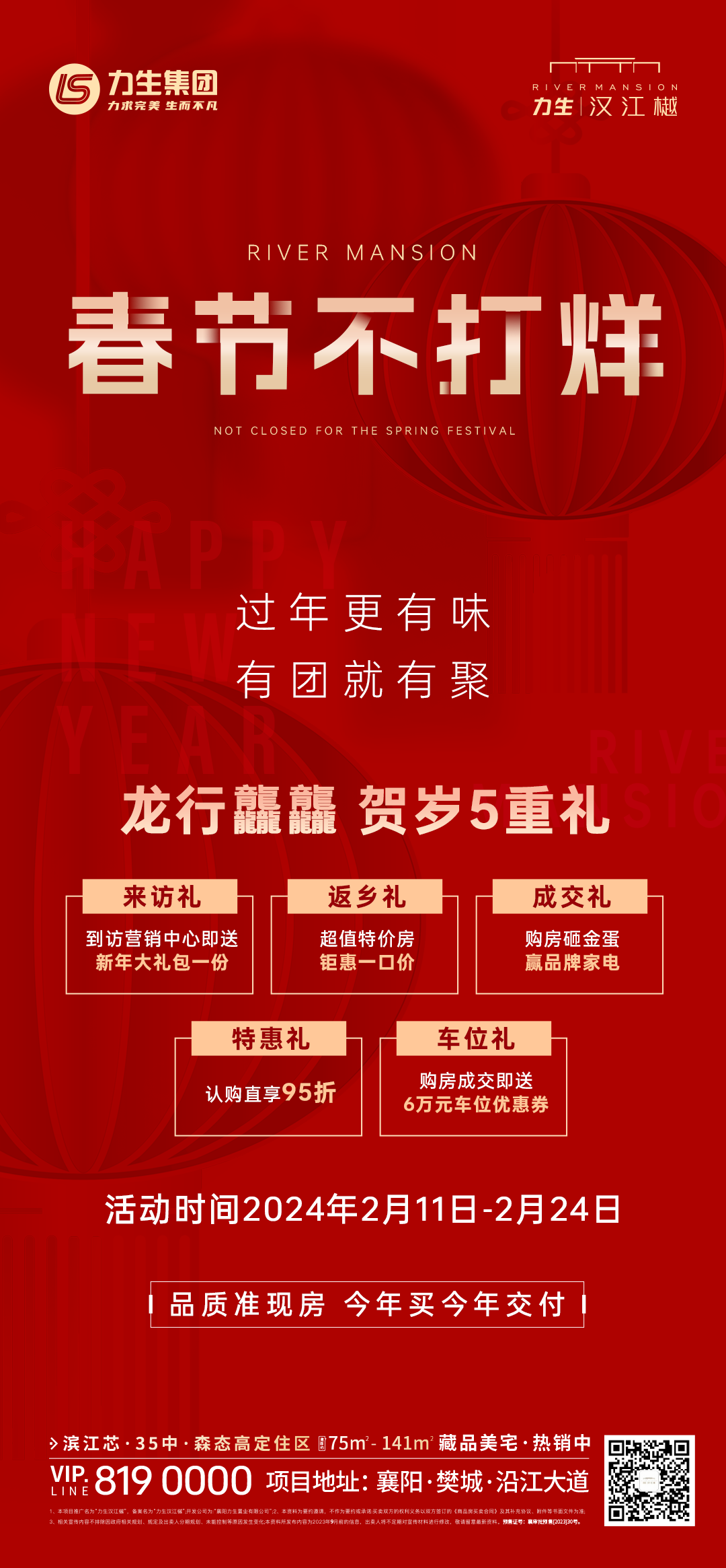 新春不打烊,龙行龘龘 春节期间到访力生汉江樾营销中心享贺岁五重礼。